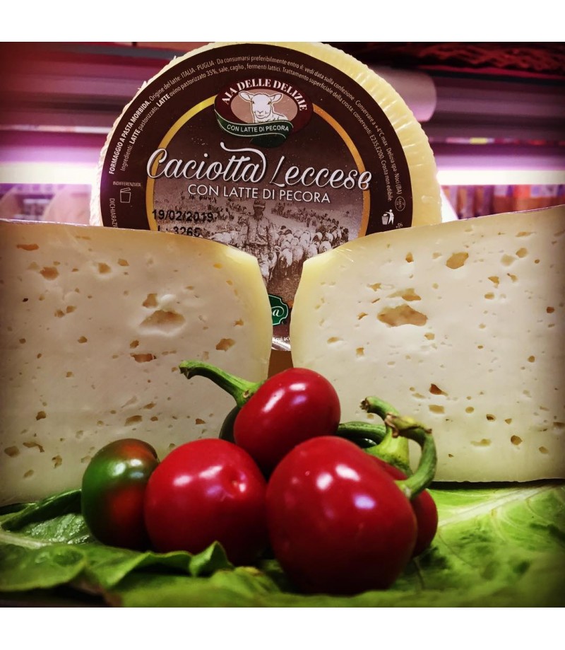 Il termine "caciotta" deriva dal linguaggio dialettale, in passato questo termine veniva utilizzato dai contadini o dagli allevatori per indicare un formaggio di piccola dimensione e di breve stagionatura, tendenzialmente infatti la caciotta è meno stagionata rispetto ad altri formaggi tipici del nostro territorio come ad esempio il pecorino. la nostra caciotta leccese è una produzione locale tipica pugliese, è un formaggio morbido preparato semplicemente con latte di pecora e mucca, caglio, fermenti e sale. Ideale per chi ama sapori delicati, consistenze morbide e non troppo sapide. Lo consigliamo anche nella preparazione di aperitivi o antipasti accompagnato con olive e taralli, il classico aperitivo Pugliese.