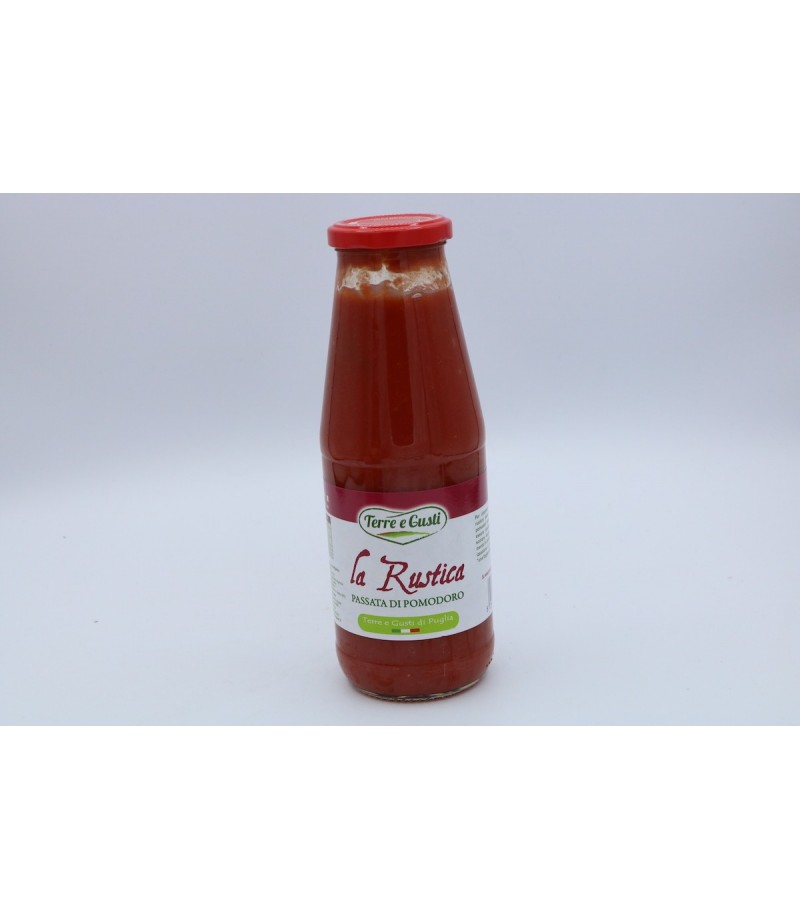 Questo è un prodotto che non può mancare in dispensa, la passata di pomodoro Rustica si differenzia dalle altre passate. Fatta ancora come un tempo, ha un sapore dolce e infondibile. Per ottenere la densità tipicamente rustica della salsa fatta in casa, i pomodori dopo la cottura e prima di essere passati, vengono lasciati a scolare lungamente. Dopo il riempimento in bottiglia e prima della pastorizzazione a bagnomaria viene aggiunta una foglia di basilico e nient'altro.