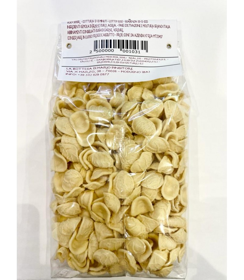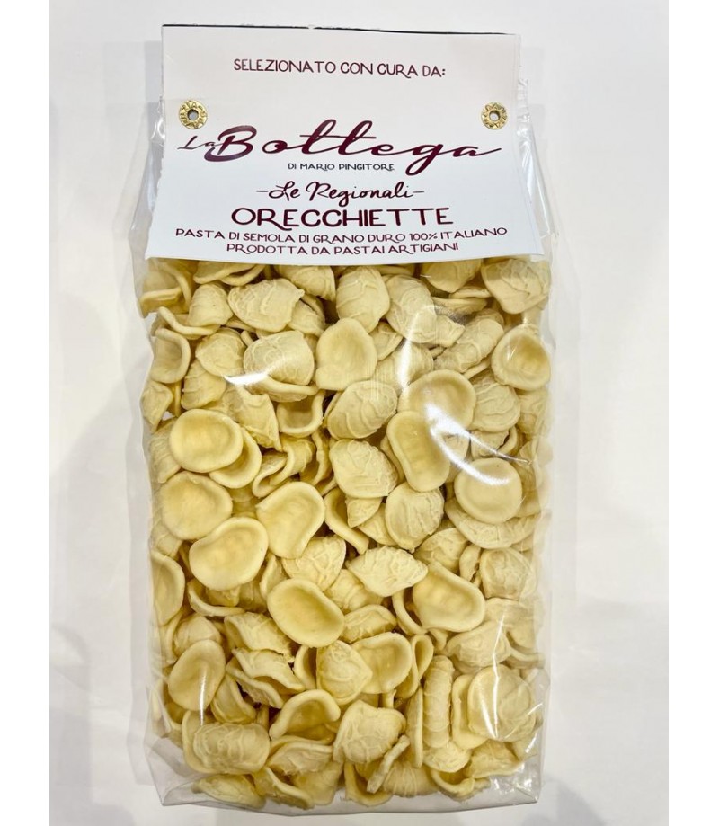 Se pensi alla Puglia e chiudi gli occhi, non può non venirti in mente l'immagine di un'orecchietta. La regina delle nostre tavole, con le cime di rapa, con un buon ragù, con qualsiasi condimento lei è la più scelta. La nostra Orecchietta viene prodotta ad Altamura, patria della panificazione e della lavorazione manuale pugliese, il grano e chiaramente raccolto nelle immediate vicinanze di questa splendida perla della nostra amata Puglia. La lavorazione e affidata a mani esperte, mani di pastai da generazioni, lo noterete! Da cosa? Un buona orecchietta deve avere una cottura uniforme, ovvero non ci deve essere differenza di consistenza tra la parte centrale e il cornicione dell'orecchietta, questo è ciò che riscontrerete nelle nostre orecchiette. Questa orecchietta merita! Non perderla!