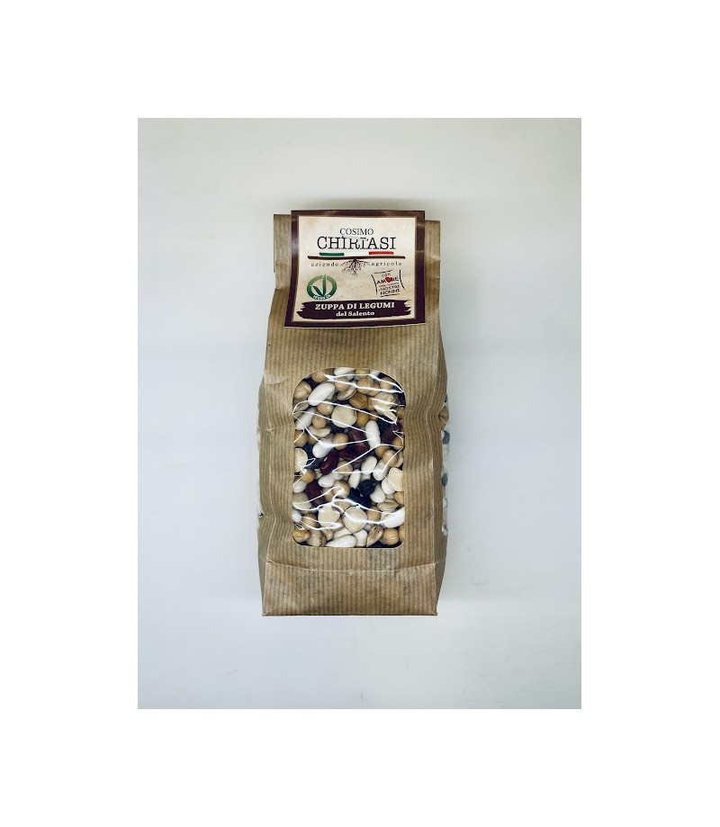Dall’abbinamento tra Ceci piccoli, Ceci grossi, Fagioli bianchi, Fagioli Borlotti, Cicerchia e Fagioli Kidney nasce una zuppa di alto valore nutritivo e dal sapore unico. Sono Legumi coltivati usando metodi e tecniche di raccolta responsabili e selezione manuale fatta in modo rigoroso e accurato. In questo modo si ottiene una Zuppa eccellente. Un misto bilanciato, ottimo come primo o unico piatto sostanzioso e nutriente. Si può abbinare ai cereali per renderla ancora più completa dal punto di vista nutrizionale.